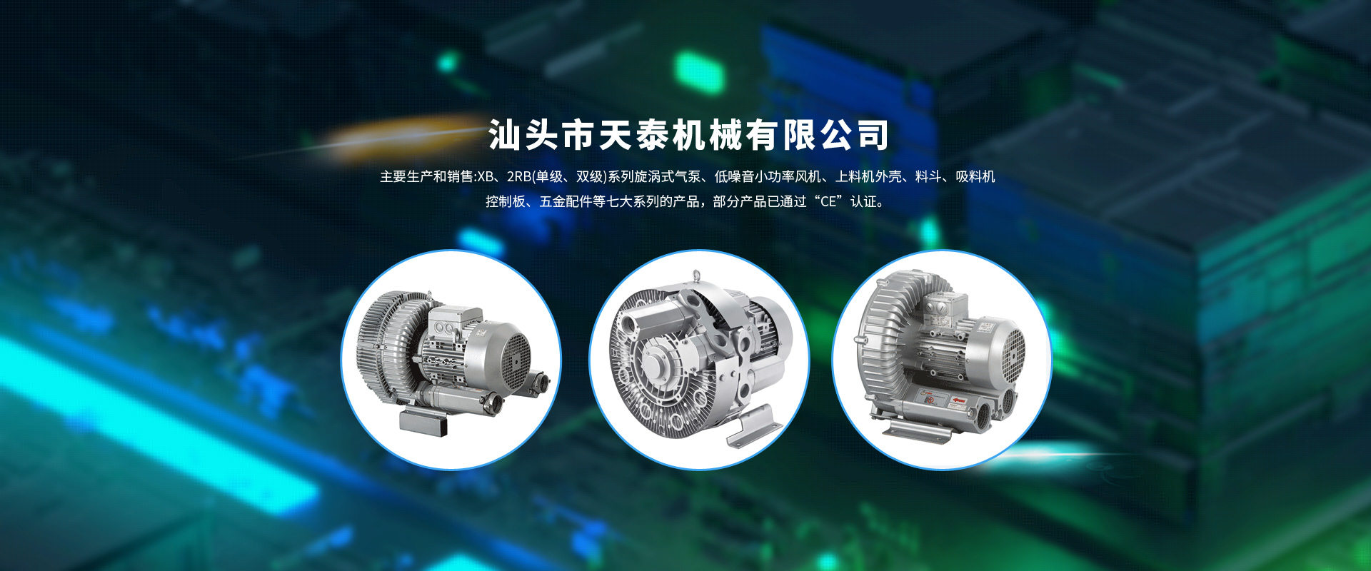 主要生產(chǎn)和銷售:XB、2RB(單級、雙級)系列旋渦式氣泵、低噪音小功率風機、上料機外殼、料斗、吸料機控制板、五金配件等七大系列的產(chǎn)品,部分產(chǎn)品已通過“CE”認證。